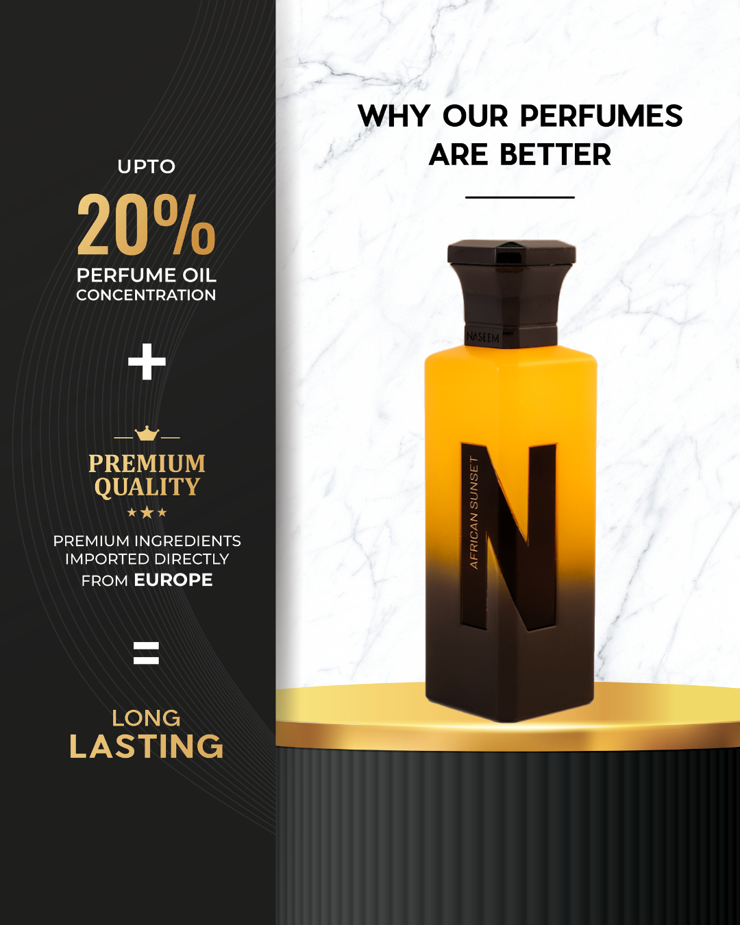 “African Sunset” comes alive with the radiant citrus glow of bergamot, beautifully complemented by a spicy, vibrant touch of pink pepper that echoes the fiery hues of the setting sun.