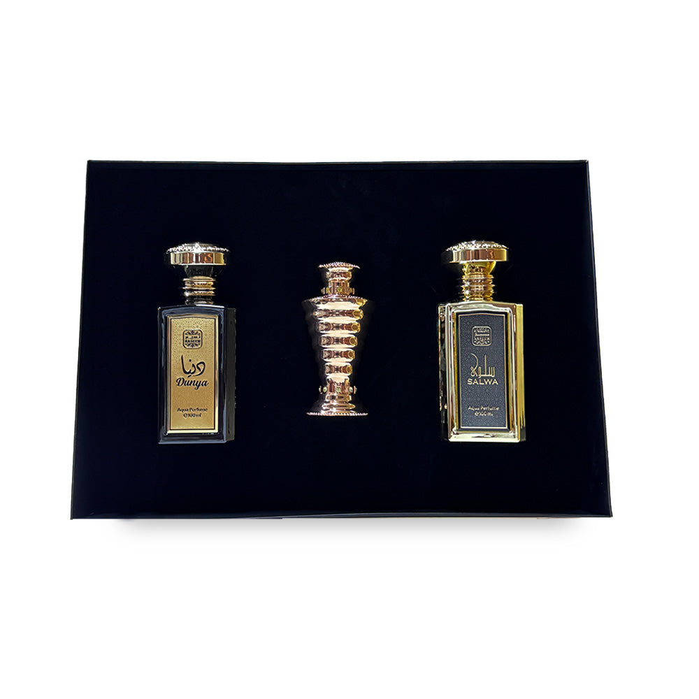 Dunya perfume 100ml, Salwa perfume 100ml, and premium perfume oil.