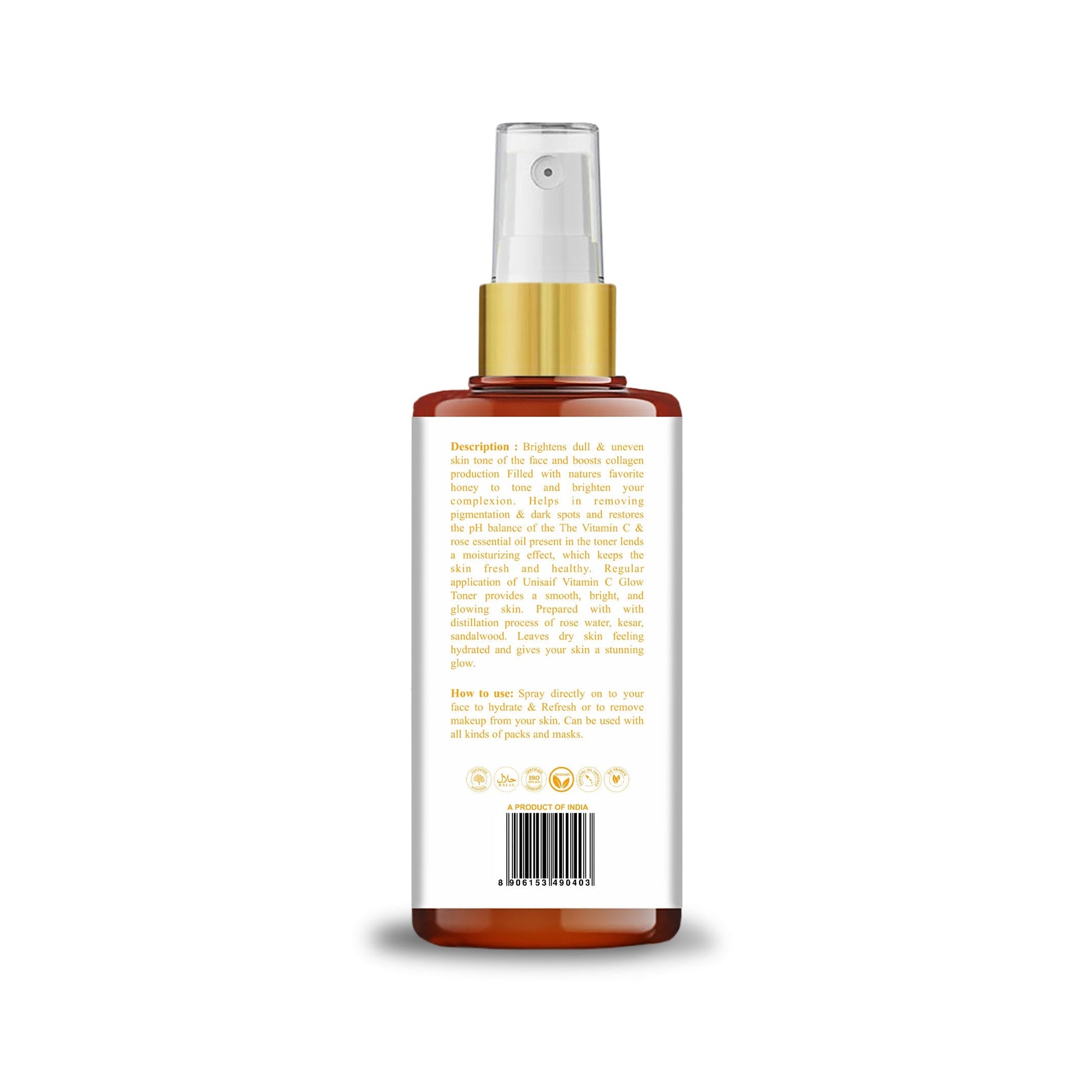 UNISAIF'S viamin C glow toner is filled with natures favourite ingredients that tones and brighten's up your complexion. Presence of vit C, honey and orange peel helps in controlling pigmentation, dark spot reduction and restoring ph of your skin. Its rose essential oil lends moisturizing effects to keep your skin feel fresh all day long. It is safe and healthy for daily use to cure dullness and uneven skin tone. Also helps in boosting collegen production of your face.